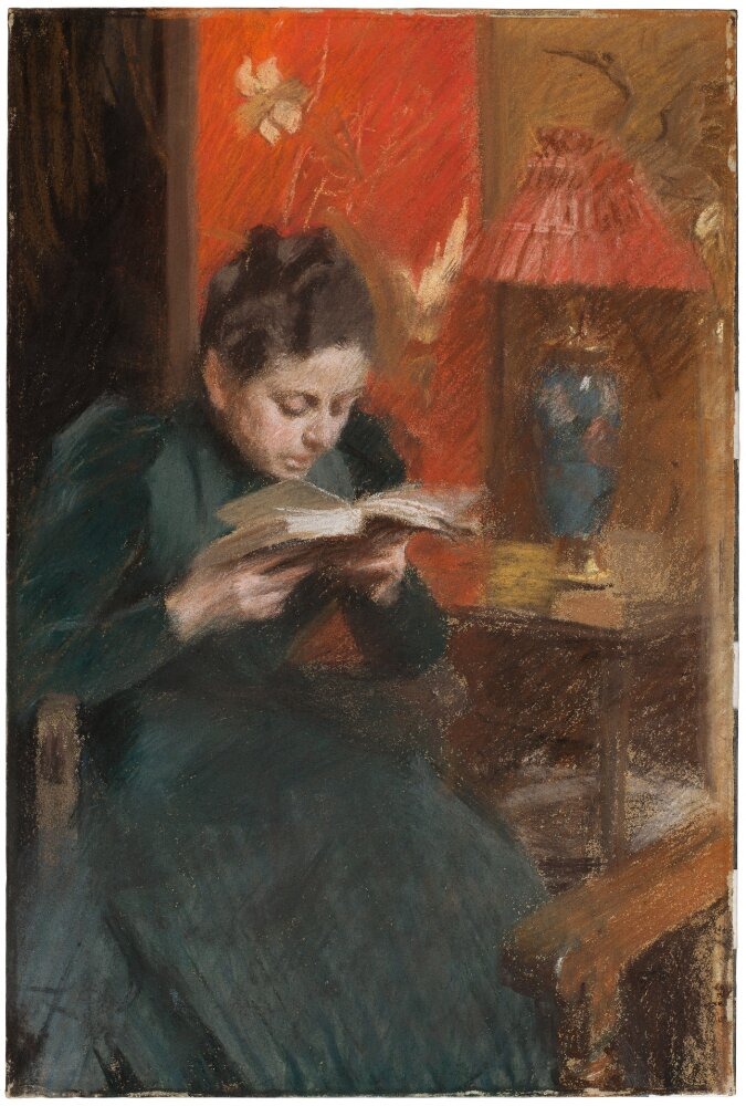 Na ślub z ukochaną musiał zapracować – wyjechał do Anglii i Hiszpani, gdzie dorobił się sporego majątku jako portrecista. Międzynarodową sławę przyniosła Zornowi podróż do USA i portrety malowane dla prezydentów i ważnych polityków. Portretował także szwedzką rodzinę królewską, malarzy, śpiewaczki operowe i innych celebrytów. Kiedy powrócił z zagranicznych wojaży, poślubił Emmę w 1885 roku, a rok później zakupił działkę w rodzinnej miejscowości Mora i rozbudował chatę niegdyś należącą do jego dziadków. Trudno powiedzieć, czy portret żony powstał we wnętrzach Zorngården, ponieważ para często podróżowała, a swój ostateczny kształt dom-pracownia artysty uzyskała dopiero w 1910 roku. Pastel ukazuje ciepłą, przytulną przestrzeń, w której młoda małżonka z zachłannością oddaje się lekturze interesującej książki. Za modnie ubraną damą stoi parawan w orientalne wzory oraz lampa wskazująca na zainteresowanie artysty japonizmem. Takie wnętrza miała ostatecznie ich eklektyczna rezydencja, a Emma pozostawała jedną z ulubionych modelek malarza, choć ich wspólny dom stał się centrum życia towarzyskiego w regionie i Zorn coraz chętniej przedstawiał również dalareńskie chłopki.