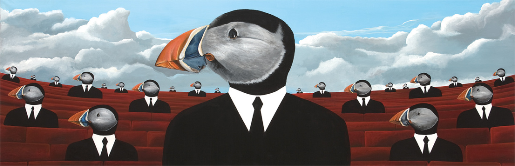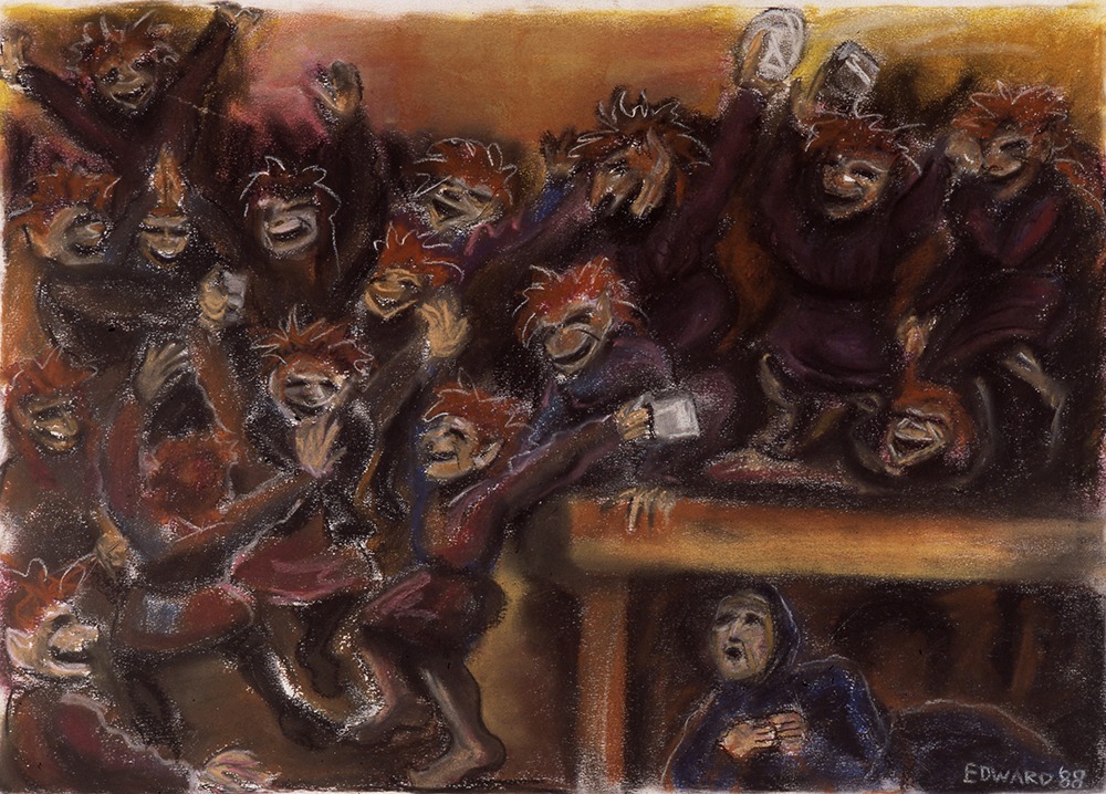Twórczość Edwarda Fuglø wielokrotnie ilustrowała odcinki naszego podcastu Elfy i trolle. Znanych jest pięć prac z 1988 roku, w których Edward Fuglø nawiązuje do farerskiego folkloru, a dokładnie ilustruje legendy i opowieści o trollach. Poniższa scena pochodzi z opowieści o zabawie trolli, które regularnie wyganiały mieszkańców wioski Trøllanes na wyspie Kalsoy, żeby świętować w samotności. W ramach tych zabaw zjadały ludzkie zapasy i dokonywały wielu szkód. W tej scenie Fuglø pokazuje dziewczynę, która nie zdążyła ewakuować się z wioski na czas i ukryła pod stołem, żeby nie zostać zauważoną przez trolle. jak skończyła się ta historia? Posłuchaj.
