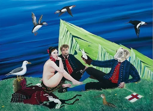 Obraz to nie tylko bezpośredni cytat z dzieła Maneta, ale też – jak głosi tytuł – z Caspara Davida Friedricha. zapewne chodzi tu o odniesienie do Morza lodu poprzez skalisty, ostry klif w tle. Śniadanie na trawie Maneta farerski artysta przerobił na piknik w porze lunchu, któremu oddaje się trójka bohaterów w farerskich strojach narodowych (kobieta zgodnie z oryginałem inspiracji – naga). Parze towarzyszy człowiek-baran oraz grupa ptaków typowych dla Wysp Owczych, a sam piknik jest właściwie nieobecny – poza królikiem prezentowanym przez człowieka-barana, ale nie zanosi się, aby to on miał być akurat skonsumowany. Obok postaci na trawie leży też farerska flaga.