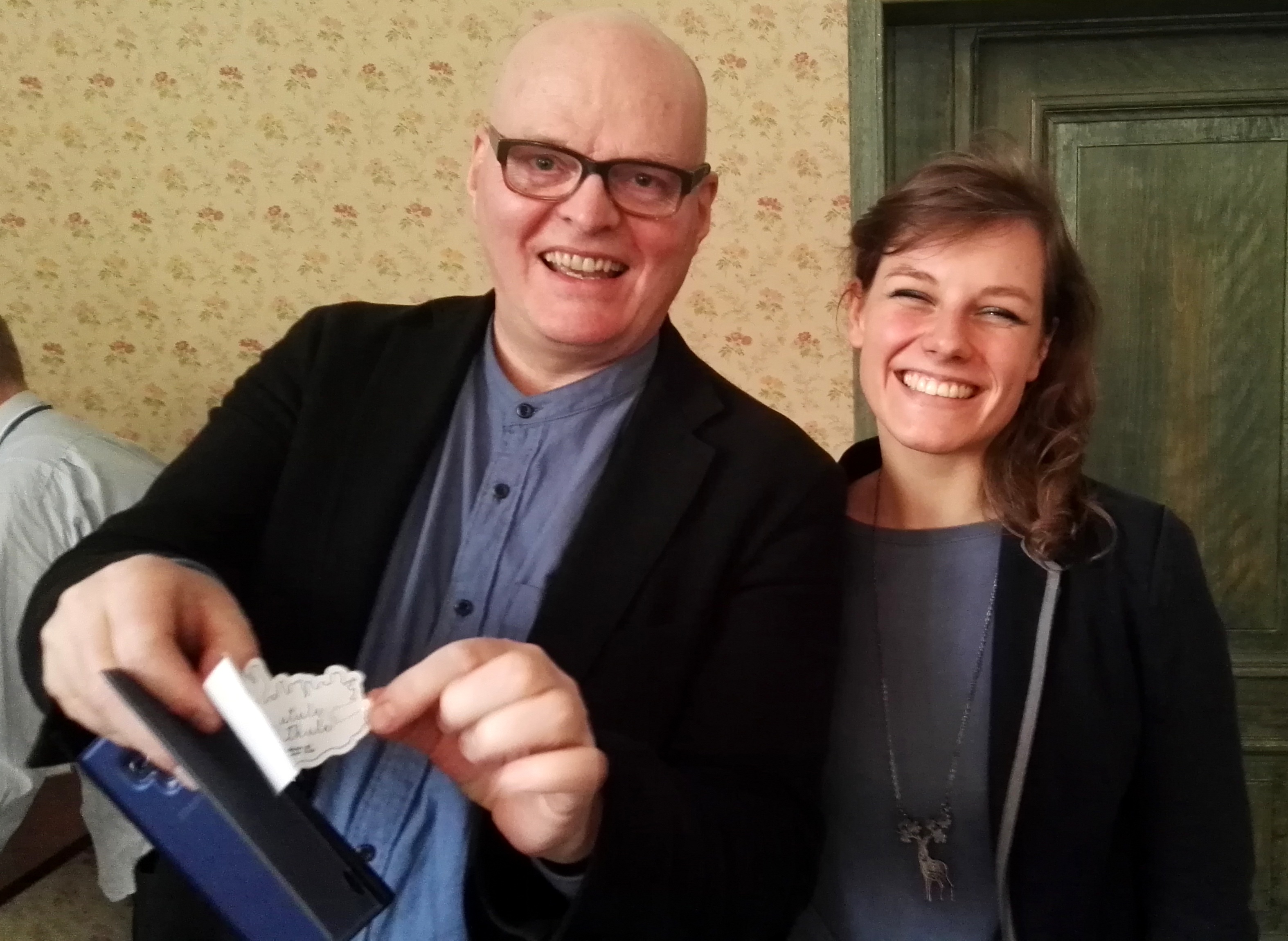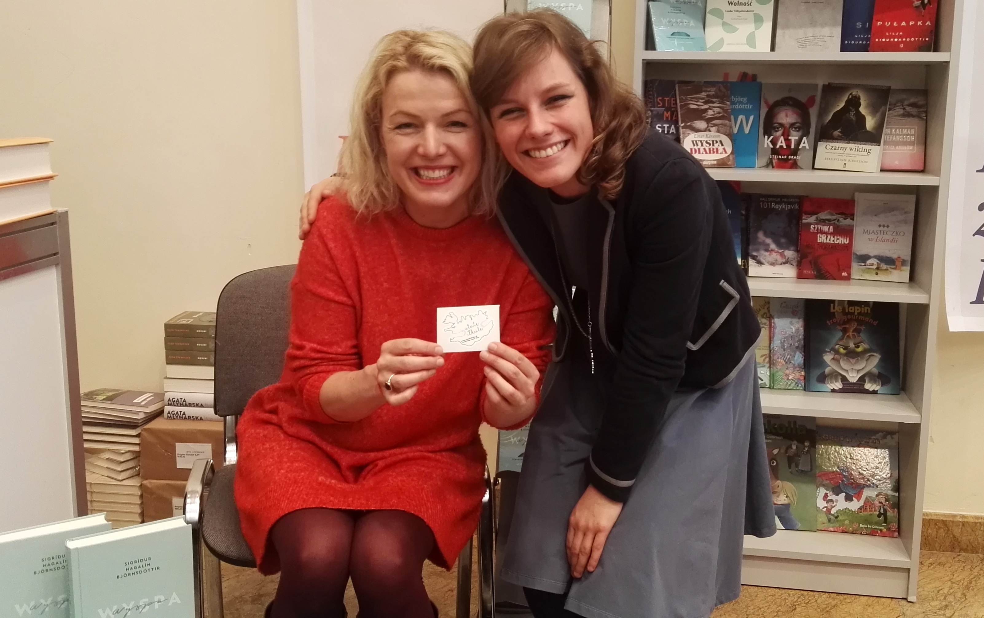 Miałam przyjemność porozmawiać z autorem przed spotkaniem, bowiem złapałam go przy stoisku Islandii, żeby wręczyć naklejkę z logo Utulę Thule. Potem nosił ją podczas całego dnia Targów, a nawet na wieńczącej sobotnie wydarzenia dyskusji. Spotkałam też wielu innych islandzkich pisarzy: Sigríður Hagalín Björnsdóttir podpisała mój egzemplarz „Wyspy”, poetka Elísabet Jökulsdóttir podarowała mi swój tomik poezji, natomiast Hallgrímur Helgason na moich oczach wkleił tulisową naklejkę do etui swojego telefonu!